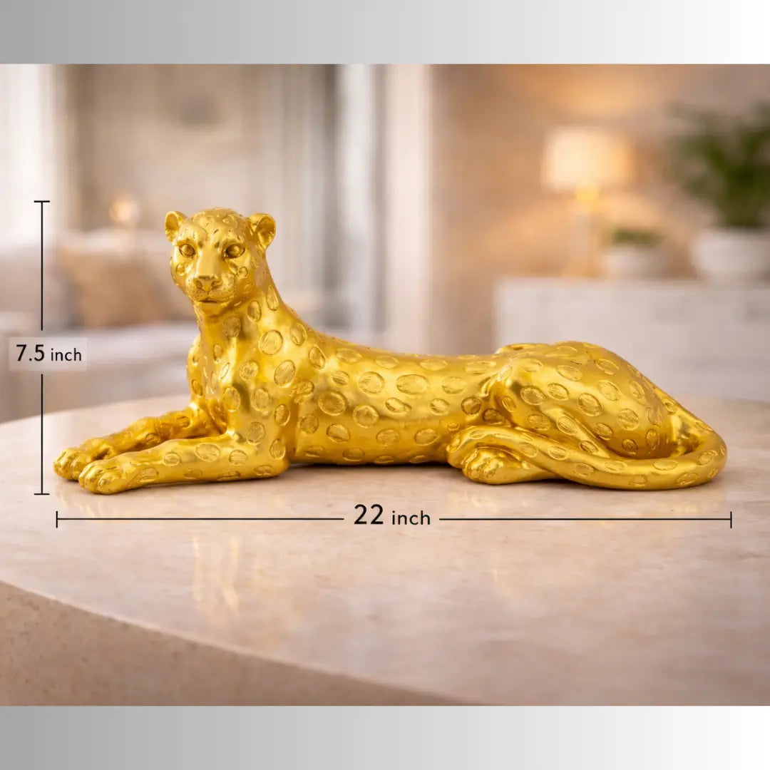Add a touch of luxury and sophistication to your interiors with this Golden Leopard Decorative Sculpture. Handcrafted with fine detailing and a smooth golden finish, this 22-inch art piece symbolizes power, grace, and confidence. Perfect for your living room, office, reception area, or luxury showroom décor, it enhances any space with its royal charm. Ideal for those who appreciate artistic craftsmanship and stylish home décor accessories.