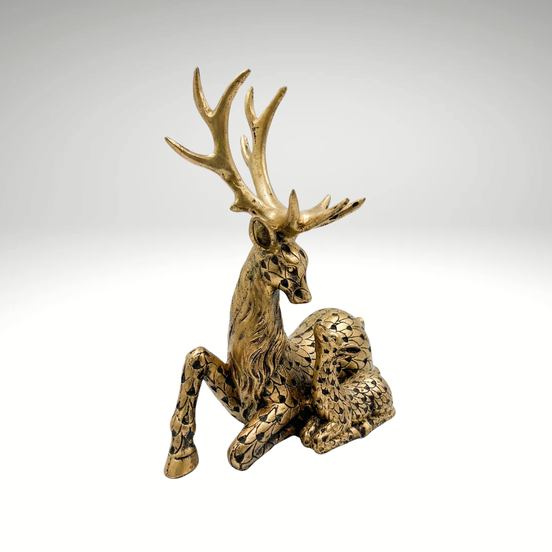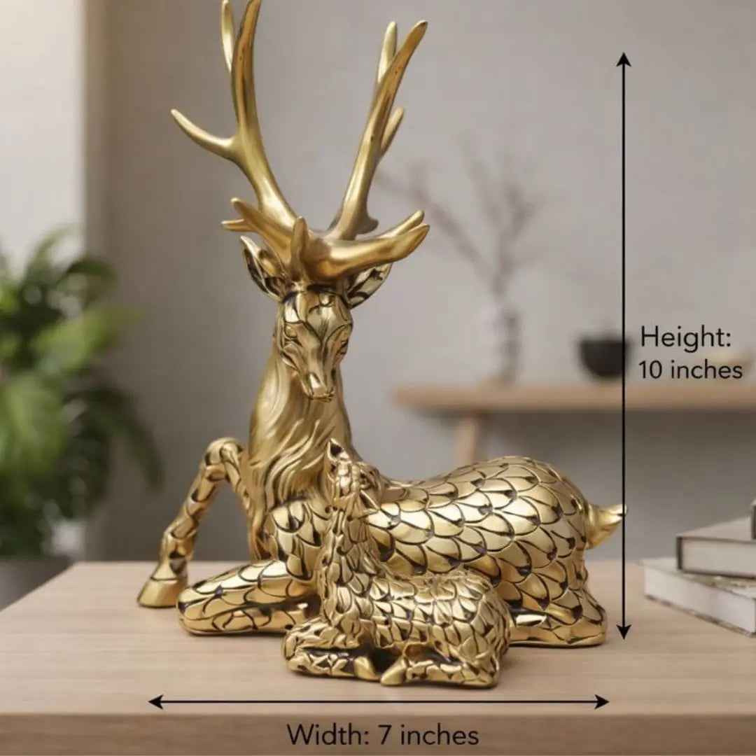 Meticulously crafted from high-quality resin and finished in a radiant golden hue with intricate black detailing, this showpiece adds a luxurious and artistic touch to your interior. Perfect for display on a mantel, bookshelf, console table, or office desk, it creates a serene and inviting atmosphere. Whether you're enhancing your own space or seeking a thoughtful gift, the Golden Grace Deer & Fawn Showpiece is a timeless choice.